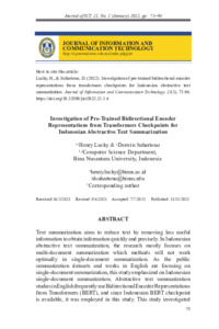 Lucky, Henry and Suhartono, Derwin (2022) Investigation of Pre-Trained Bidirectional Encoder Representations from Transformers Checkpoints for Indonesian Abstractive Text Summarization. Journal of Information and Communication Technology, 21 (01). pp. 71-94. ISSN 2180-3862