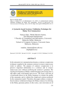 Alias, Suraya and Sainin, Mohd Shamrie and Mohammad, Siti Khaotijah (2021) A Syntactic-based Sentence Validation Technique for Malay Text Summarizer. Journal of Information and Communication Technology, 20 (03). pp. 329-352. ISSN 2180-3862