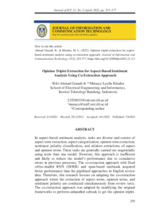 Ahmad Genadi, Rifo and Khodra, Masayu Leylia (2022) Opinion Triplet Extraction for Aspect-Based Sentiment Analysis Using Co-Extraction Approach. Journal of Information and Communication Technology, 21 (02). pp. 255-277. ISSN 2180-3862