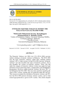 Mohammed Na'aim, Mohd Safri and Rajamanickam, Ramalinggam and Nordin, Rohaida (2022) Intimate Partner Violence Within the Malaysian Legal Framework. UUM Journal of Legal Studies (UUMJLS), 13 (01). pp. 131-154. ISSN 2229-984X