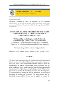 Zulkupri, Muhammad Iqram and Mahmood, Anida and Zainol, Zinatul Ashiqin and Hasmin, Nor Akhmal (2022) Consumer related theories and the right to informed choice for consumer in Nano Food Consumption. UUM Journal of Legal Studies (UUMJLS), 13 (01). pp. 199-220. ISSN 2229-984X