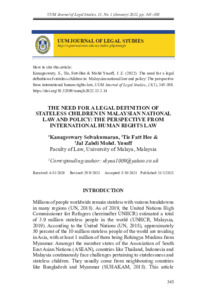 Selvakumaran, Kanageswary Sanggitha and Tie, Fatt Hee and Mohd Yusoff, Jal Zabdi (2022) The Need for A Legal Definition of Stateless Children in Malaysian National Law and Policy: The Perspective from International Human Rights Law. UUM Journal of Legal Studies (UUMJLS), 13 (01). pp. 345-380. ISSN 2229-984X