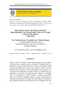 Ismon, Nur Yuhanis and Ali, Zuraidah and Hingun, Mohsin (2021) The Application of Public Benefit Requirement of Charitable Trust in Waqf Court Judgment: A Review. UUM Journal of Legal Studies (UUMJLS), 12 (02). pp. 141-165. ISSN 2229-984X