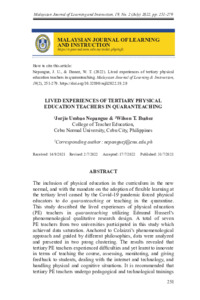 Nepangue, Jorjie Umbao and Ibanez, Wilson (2022) Lived experiences of tertiary physical education teachers in quaranteaching. Malaysian Journal of Learning and Instruction (MJLI), 19 (2). pp. 251-279. ISSN 1675-8110