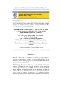 Ismail, Siti Noor and Muhammad, Shamsuddin and Omar, Mohd Norakmar and Shanmugam, Kanageswari Suppiah (2022) The practice of critical thinking skills in teaching mathematics: Teachers’ perception and readiness. Malaysian Journal of Learning and Instruction (MJLI), 19 (1). pp. 1-30. ISSN 1675-8110