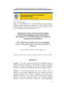 Abdullah, Melissa Ng Lee Yen and Tiew, Chia Chun (2022) The effects of language teachers’ attitudes, barriers and enablers in teaching 21st century skills at Chinese vernacular schools. Malaysian Journal of Learning and Instruction (MJLI), 19 (1). pp. 115-146. ISSN 1675-8110