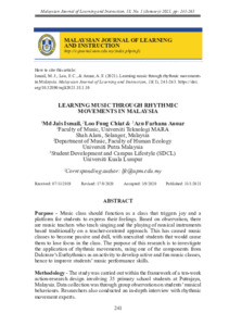 Ismail, Md Jais and Loo, Fung Chiat and Anuar, Azu Farhana (2021) Learning music through rhythmic movements in Malaysia. Malaysian Journal of Learning and Instruction (MJLI), 18 (1). pp. 241-263. ISSN 1675-8110