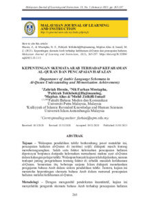 Hussin, Zahriah and Mustapha, Nik Farhan and Toklubok@Hajimaming, Pabiyah and Alias, Majdan and Ismail, Muhd Zulkifli (2021) Kepentingan Skemata Arab terhadap kefahaman Al-Quran dan pencapaian hafazan. Malaysian Journal of Learning and Instruction (MJLI), 18 (1). pp. 265-287. ISSN 1675-8110