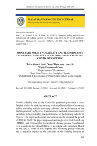 Sani, Idris Ahmed and Lawal, Yusuf Dansuma and Ome, Wada Emmanuel (2022) Monetary policy volatility and performance of banking industry in Nigeria: Signs from the Covid-19 pandemic. Malaysian Management Journal, 26. pp. 169-186. ISSN 0128-6226