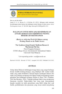 Ismail, Nur Syakiran Akmal and Hassan, Kalthum and Ma'adan, Marfunizah (2022) Halangan untuk mencapai keseimbangan antara kerjaya dan kehidupan wanita bekerja di sektor awam. Jurnal Pembangunan Sosial (JPS), 25. pp. 169-190. ISSN 1394-6528