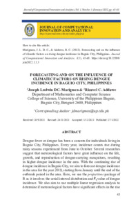 Marigmen, Joseph Ludwin De Castro and Addawe, Rizavel Corsino (2022) Forecasting and on the influence of climatic factors on rising Dengue incidence in Baguio City, Philippines. Journal of Computational Innovation and Analytics (JCIA), 01 (01). pp. 43-68. ISSN 2821-3408