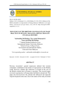 Md Dahlan, Salehuddin and Mohamad, Nor Asiah and Md Dahlan, Nuarrual Hilal (2022) Influence of the British colonialist on Waqf practice in Penang, Malaysia: Reflections on its legal history. UUM Journal of Legal Studies (UUMJLS), 13 (1). pp. 295-316. ISSN 2229-984X