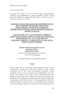 Mohd Asaad, Mohd Norhasni and Iteng, Rosman and Saad, Rohaizah (2019) Jangka Masa Pelaksanaan Pembuatan Lean Mempengaruhi Prestasi Organisasi: Analisis Syarikat Pembuatan di Malaysia Menggunakan Model Rasch. International Journal of Management Studies (IJMS), 26 (1). pp. 147-167. ISSN 2180-2467