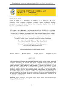 Nordin, Norhafizi and Amin, Umme Umaimah and Hasbullah, Siti Aminah and Zainol, Noor Azimin and Ideris, Muhamad Shah Kamal (2021) Investigating The Relationships Between Manager’s Coffee Restaurant Dining Experiences and Customer Satisfaction. Journal of Event, Tourism and Hospitality Studies (JETH), 1. pp. 26-48. ISSN eISSN 2805-4423