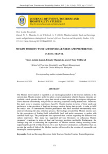 Zainol, Noor Azimin and Mustafa, Eshaby and Willibrod, Averyl Tony (2021) Muslim Tourists’ Food and Beverage Needs and Preferences During Travel. Journal of Event, Tourism and Hospitality Studies (JETH), 1. pp. 121-142. ISSN eISSN 2805-4423