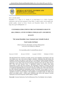 Hasbullah, Siti Aminah and Amin, Umme Umaimah and Nordin, Norhafizi and Abd Razak, Nurul Asmida (2021) Customer Satisfaction in The Fast Food Restaurant in Arau, Perlis: A Study on Price, Food Quality and Service Quality. Journal of Event, Tourism and Hospitality Studies (JETH), 1. pp. 163-183. ISSN eISSN 2805-4423