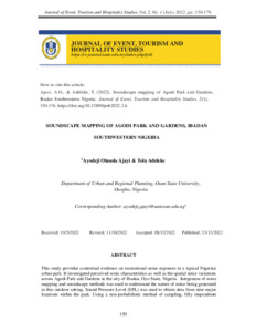 Ajayi, Ayodeji Olusola and Adeleke, Tola (2022) Soundscape Mapping of Agodi Park and Gardens, Ibadan Southwestern Nigeria. Journal of Event, Tourism and Hospitality Studies (JETH), 2. pp. 150-176. ISSN eISSN 2805-4423