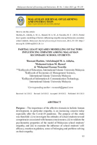 Hashim, Rosnani and Aldaba, Abdulmajid Mohammed and M.Haneef, Mohamed Aslam and Noordin, Mohamad Fauzan (2023) Partial Least Squares Modelling of Factors Influencing Empathy Among Malaysian Secondary School Students. Malaysian Journal of Learning and Instruction (MJLI), 20 (1). pp. 93-119. ISSN 1675-8110
