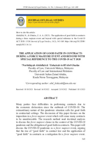 Abdullah, Nurhidayah and Abd Ghadas, Zuhairah Ariff (2023) The Application of Good Faith in Contracts During a Force Majeure Event and Beyond with Special Reference to The Covid-19 Act 2020. UUM Journal of Legal Studies (UUMJLS), 14 (1). pp. 141-160. ISSN 2229-984X
