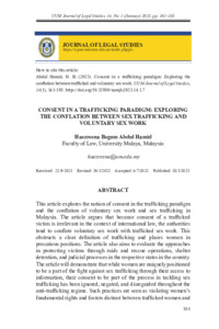 Abdul Hamid, Haezreena Begum (2023) Consent in A Trafficking Paradigm: Exploring the Conflation Between Sex Trafficking and Voluntary Sex Work. UUM Journal of Legal Studies (UUMJLS), 14 (1). pp. 161-188. ISSN 2229-984X