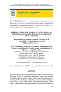 | Uncontrolled Keywords: | Dokumen digital, kebolehterimaan, kaedah pembuktian, prosedur operasi standard (SOP), mahkamah sivil |