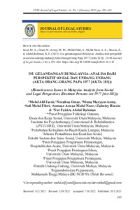 Jasni, Mohd Alif and Omar, Noralina and Azmy, Muna Maryam and Fikri, Sofi Mohd and Mohd Noor, Annuar Aswan and Hussin, Zalmizy and Abdul Rahman, Nur Faizira (2023) Isu Gelandangan di Malaysia: Analisa dari perspektif sosial dan undang-undang (Akta Orang-Orang Papa 1977 [Akta 183]). UUM Journal of Legal Studies (UUMJLS), 14 (1). pp. 391-424. ISSN 2229-984X