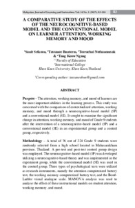 Purpose - The attention, working memory, and mood of learners are the most important abilities in the learning process. The importance of these abilities has led the researchers to undertake the present study. This study was concerned with the comparison of contextualized attention, working memory, and mood through a neurocognitive-based model (5P) and a conventional model (5E). It sought to examine the significant change in attention, working memory, and mood of Grade 9 students after the intervention of a neurocognitive-based model (5P) and a conventional model (5E) in an experimental group and a control group, respectively. Methodology - A total of 76 out of 324 Grade 9 students were randomly selected from a high school located in Mahasarakham province, Thailand. A pre-test and post-test control group design was employed. The neurocognitive-based model (5P) was developed utilizing a neurocognitive-based theory and was implemented in the experiment group, while the conventional model (5E) was used in the control group. Three types of psychological tests were utilized as research instruments, namely the attention computerized battery test, the working memory computerized battery test, and the Bond-Ladder visual analogue scale. MANOVA analysis was used to analyse the effect of these instructional models on student attention, working memory, and mood in Grade 9. Findings - The findings revealed that the overall attention, working memory, and mood conditioning mean score of the neurocognitive based model (5P) interventions were better than in the conventional model. In conclusion, the results revealed that neurocognitive based contextualization had more effect on the attention, working memory, and mood of Grade 9 students than conventional model (5E) contextualization. Significance - The findings have contributed significantly to current knowledge on the effectiveness of the neurocognitive-based model (5P) to enhance student learning outcomes in terms of attention, working memory and mood.
