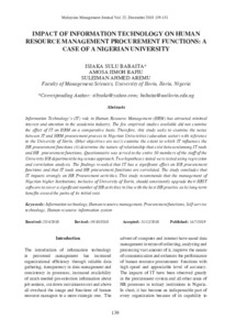 Information Technologys (IT) role in Human Resource Management (HRM) has attracted minimal interest and attention in the academia industry. The few empirical studies available did not examine the effect of IT on HRM on a comparative basis. Therefore, this study seeks to examine the nexus between IT and HRM procurement process in Nigerian Universities (education sector) with reference to the University of Ilorin. Other objectives are to:(i) examine the extent to which IT influences the HR procurement functions (ii) determine the nature of relationship that exist between/among IT tools and HR procurement functions. Questionnaire was served to the entire 50 members of the staff of the University HR department being census approach. Two hypotheses stated were tested using regression and correlation analysis. The findings revealed that IT has a significant effect on HR procurement functions and that IT tools and HR procurement functions are correlated. The study concludes that IT impacts strongly on HR Procurement activities. This study recommends that the management of Nigerian higher Institutions, inclusive of University of Ilorin, should consistently upgrade their HRIT software to cover a significant number of HR activities in line with the best HR practice as its long-term benefits exceed the pains of its initial cost.