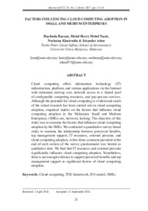 Hassan, Haslinda and Mohd Nasir, Mohd Herry and Khairudin, Norhaiza and Adon, Iskandar (2017) Factors Influencing Cloud Computing Adoption in Small Medium Enterprises. Journal of Information and Communication Technology (JICT), 16 (1). pp. 21-41. ISSN 1675-414X