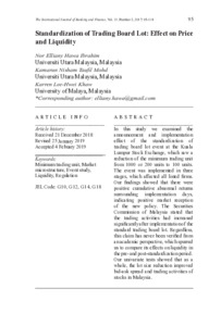 Ibrahim, Nor Elliany Hawa and Mohd, Kamarun Nisham Taufil and Lee, Karren Hwei Khaw (2017) Standardization of Trading Board Lot: Effect on Price and Liquidity. International Journal of Banking and Finance (IJBF), 13 (2). pp. 95-118. ISSN 2590-423X