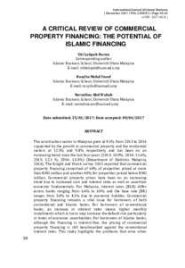 Harun, Siti Latipah and Mohd Yusof, Rosylin and Abd Wahab, Norazlina (2017) A Critical Review of Commercial Property Financing: The Potential of Islamic Financing. International Journal of Islamic Business (IJIB), 2 (2). pp. 38-63. ISSN 0127- 662X
