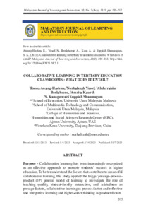 Awang-Hashim, Rosna and Yusof, Norhafezah and Benlahcene, Abderrahim and Kaur, Amrita and Shanmugam, S. Kanageswari Suppiah (2023) Collaborative Learning in Tertiary Education Classrooms: What Does It Entail? Malaysian Journal of Learning and Instruction (MJLI), 20 (2). pp. 205-232. ISSN 1675-8110