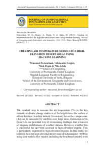 Forooshani, Massoud and Gegov, Alexander and Pepin, Nick and Adda, Mo (2023) Creating Air Temperature Models for High-Elevation Desert Areas Using Machine Learning. Journal of Computational Innovation and Analytics (JCIA), 2 (1). pp. 1-19. ISSN 2821-3408