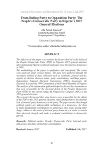 Innocent, Alfa Patrick and Yusoff, Kamarul Azman and Rajanthiran, Sivaperegasam P. (2017) From Ruling Party to Opposition Party: The People’s Democratic Party in Nigeria’s 2015 General Elections. Journal of Governance and Development (JGD), 13 (2). pp. 47-59. ISSN 2289-4756