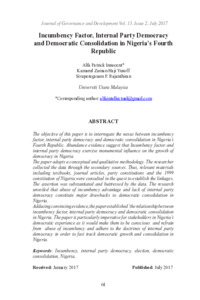 Innocent, Alfa Patrick and Yusoff, Kamarul Zaman and Rajanthiran, Sivaperegasam P. (2017) Incumbency Factor, Internal Party Democracy and Democratic Consolidation in Nigeria’s Fourth Republic. Journal of Governance and Development (JGD), 13 (2). pp. 61-74. ISSN 2289-4756