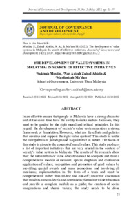 Muslim, Sakinah and Zainal Abidin, Nor Azizah and Ma’dan, Marfunizah (2022) The Development of Value Systems in Malaysia: In Search of Effective Initiatives. Journal of Governance and Development (JGD), 18 (2). pp. 21-37. ISSN 2289-4756