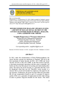 Hungsavanus, Songkhla and Akkasriworn, Woraporn (2022) Reform Needed for Thailand’s Pension System: A Review of Old Age Social Security in The Context of Insurer Needs in Phuket, Thailand, Using Alderfer's Erg Theory. Journal of Governance and Development (JGD), 18 (2). pp. 65-75. ISSN 2289-4756