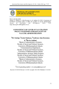 Satispi, Evi and Shabana, Amin and Kususma, Andrean Alan (2022) Consistency of Covid-19 Vaccination Policy in Efforts for Equality of Vaccine Administration. Journal of Governance and Development (JGD), 18 (2). pp. 77-97. ISSN 2289-4756