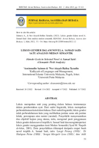 Leksis merupakan unit yang penting dalam bahasa terutamanya dalam pembentukan ayat. Dari sudut linguistik, leksis merupakan perbendaharaan kata dalam bahasa. Dari sudut linguistik, leksis gender ialah perbendaharaan kata yang melibatkan jantina sama ada jantina lelaki, perempuan atau neuter (neutral). Penyelidik menyenaraikan dua objektif kajian yang utama, iaitu, mengenal pasti penggunaan leksis gender dalam novel terpilih A. Samad Said dan menginterpretasi leksis gender menggunakan teori Medan Semantik (Syed M. Naquib al-Attas, 2001). Data penyelidikan dikumpul daripada empat buah novel terpilih A. Samad Said, iaitu ‘Langit Petang (1980)’, ‘Di Hadapan Pulau (2000)’, ‘Sungai Mengalir Lesu (2005)’, dan ‘Adik Datang (2012)’. Dalam penyelidikan ini, penyelidik menggunakan kaedah kualitatif bagi menjawab objektif kajian. Penyelidik juga menggunakan kaedah analisis kandungan teks bagi mengenal pasti leksis gender yang terdapat dalam novel terpilih A. Samad Said. Data leksis gender yang terdapat pada novel tersebut akan dianalisis menggunakan Teori Medan Semantik S. Ullmann (1963) menerusi pendekatan model analisis T. Izutsu (1964) dan Syed M. Naquib al-Attas (1970 dan 2001). Hasil penyelidikan mendapati bahawa leksis gender yang dipaparkan dalam novel terpilih A. Samad Said dikategorikan kepada tujuh kata fokus, iaitu kekeluargaan, bentuk panggilan, gelaran, pekerjaan/jawatan, kata sifat, kata ganti nama diri dan kata nama. Selanjutnya, daripada 10,398 leksis gender yang dikaji, didapati leksis gender daripada kategori kata ganti nama diri mencatatkan jumlah tertinggi, iaitu sebanyak 5,297 kekerapan, diikuti pula leksis gender daripada kategori kekeluargaan yang berjumlah 1,928 kekerapan dan leksis gender daripada kategori bentuk panggilan sebanyak 1,410 kekerapan. Hasil dapatan akhir menunjukkan bahawa setiap kata fokus akan menerbitkan satu konsepsi berdasarkan medan semantik yang melatarinya. Kata fokus yang dinyatakan mempunyai jalinannya dengan makna setiap kata kunci yang mengelilingi kata fokus yang membentuk lingkungan konsepsi sehingga membentuk medan semantik bagi leksis gender dalam novel terpilih A. Samad Said.