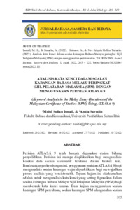 Ismail, Mohd Sufian and Sarudin, Anida (2022) Analisis Kata Kunci Dalam Soalan Karangan Bahasa Melayu Peringkat Sijil Pelajaran Malaysia (SPM) Dengan Menggunakan Perisian Atlas.Ti 9. RENTAS: Jurnal Bahasa, Sastera dan Budaya, 1 (1). pp. 205-222. ISSN 2976-3126