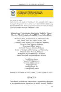 Che Pa, Noraziah and Lim, Laura Sie-Yi and Yusoff, Nooraini and Wan Yahaya, Wan Ahmad Jaafar and Ishak, Rusdi (2023) A Game-based Psychotherapy Intervention Model for Memory Disorder: Model Validation Using EEG Neurofeedback Data. Journal of Information and Communication Technology, 22 (4). pp. 619-655. ISSN 2180-3862