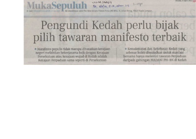 Mohd Sani, Mohd Azizuddin (2023) Pengundi Kedah Perlu Bijak Pilih Tawaran Manifesto Terbaik. Pengundi Kedah Perlu Bijak Pilih Tawaran Manifesto Terbaik. p. 10.