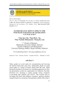 Lim, Ying San and Ng, Tuan Hock and Mohamad, Wan Normila and Lim, Cheng Ee (2022) Facebook Live-Streaming: How It Affect the Purchase Intention of Generation Y in Malaysia? Journal of Business Management and Accounting (JBMA), 12 (1). pp. 25-49. ISSN 2231-9298 (e2636-9249)