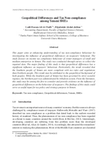 This paper aims at enhancing understanding of tax non-compliance behaviour by investigating the influence of geopolitical differences on taxpayers behaviour. The study focuses on income tax compliance behaviour of owner-managers of small and medium enterprises in Yemen. The study was conducted through survey to collect the required data. The major finding of this study is that geopolitical differences has a significant influence on taxpayers behaviour. Particularly, the result revealed that the Southern people of Yemen are more compliant with tax rules and regulations than Northern people. This result may be attributed to the geopolitical background of both peoples. While the Southern part of Yemen has been governed by strict socialist regimes, the Northern part was administrated by tribalism system. From the literature, this study may be among the first to consider and provide evidence on the influence of geopolitical differences on the behaviour of taxpayers. The findings of this study could serve as useful input for tax policy and strategy purpose in Yemen.