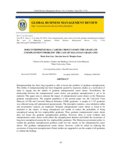 Lim, Hock Eam and Soon, Jan Jan and Duan, Hongbo (2021) Does Entrepreneurial Career Choice Lessen the Graduate Unemployment Problem? The Case of Malaysian Graduates. Global Business Management Review (GBMR), 13 (1). pp. 37-56. ISSN 2180-2416