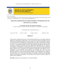 Alias, Nur Fikriyah and Che Sulaiman, Nor Fatimah (2023) The Social Resilience of Urban Poverty Toward Quality of Life in Kuala Lumpur. Journal of Economics and Sustainability (JES), 5 (2). pp. 43-57. ISSN 2637-1294