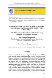 Kajian ini memberikan tumpuan kepada isu kesihatan mental dan tahap motivasi dalam kalangan anggota Palapes (Pasukan Latihan Pegawai Simpanan) Universiti Utara Malaysia (UUM). Terdapat tiga elemen utama bagi kesihatan mental iaitu kemurungan, kebimbangan dan tekanan yang telah dikenalpasti hubungannya dengan motivasi intrinsik dan motivasi ektrinsik. Kajian ini juga bertujuan untuk mengenal pasti tahap kesihatan mental dan motivasi di kalangan anggota Palapes UUM. Selain itu, kajian ini juga menguji perbezaan tahap kesihatan mental dan motivasi berdasarkan jantina. Objektif terakhir adalah untuk mengkaji hubungan antara kesihatan mental dan motivasi dalam kalangan anggota Palapes UUM. Kajian ini berbentuk kuantitatif dengan melibatkan soal selidik sebagai instrumen kajian. Skala Kemurungan, Kebimbangan, dan Tekanan (Depression, Anxiety dan Stress Scale -DASS-21) digunakan untuk mengukur tahap kesihatan mental di kalangan anggota Palapes UUM manakala Students Work Preference Inventory (SWPI) digunakan untuk mengukur tahap motivasi pelajar. Seramai 152 responden dipilih secara persampelan bertujuan daripada tiga pasukan Palapes di UUM iaitu Darat, Laut dan Udara. Data yang diperoleh dianalisis menggunakan perisian Statistical Package of Social Sciences (SPSS) versi 29. Analisis yang dilakukan termasuk analisis frekuensi, peratusan, ujian-T sampel bebas dan Korelasi Pearson. Dapatan kajian menunjukkan bahawa tahap kemurungan, kebimbangan dan tekanan dalam kalangan pelajar Palapes UUM berada pada tahap normal. Tahap motivasi intrinsik adalah tinggi manakala motivasi ektrinsik adalah sederhana. Selain itu, hasil kajian juga menunjukkan terdapat perbezaan tahap kesihatan mental dan motivasi antara lelaki dan perempuan. Kajian ini juga memberikan bukti adanya hubungan positif antara kesihatan mental dan motivasi pelajar. Kesimpulannya, hasil kajian ini dapat digunakan sebagai rujukan oleh pihak-pihak yang terlibat dalam meningkatkan kesedaran terhadap kesihatan mental dan motivasi dalam kalangan pelajar Palapes UUM.
