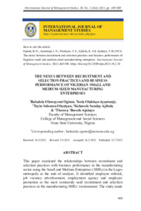Oginni, Babalola Oluwayemi and Ayantunji, Isola Olalekan and Olaniyan, Toyin Solomon and Ajibola, Kolawole Sunday and Ajakaye, Theresa ‘Bosede (2023) The Nexus Between Recruitment and Selection Practices and Business Performance of Nigerian Small and Medium-Sized Manufacturing Enterprises. International Journal of Management Studies (IJMS), 30 (2). pp. 469-500. ISSN 2232-1608