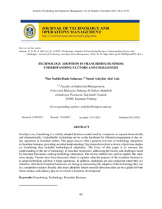 Sabaran, Nur Nabila Huda and Abd Aziz, Nurul Ashykin (2023) Technology Adoption in Franchising Business: Understanding Factors and Challenges. Journal of Technology and Operations Management (JTOM), 18 (2). pp. 49-59. ISSN 2590-4175 (Online)