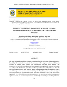 Ismail, Radzi and Othmani, Muhammad Izzat and Said, Ilias and Dan, Wang (2023) The Effective Project Management Approach Towards Minimising Environmental Impacts in The Construction Industry. Journal of Technology and Operations Management (JTOM), 18 (2). pp. 60-72. ISSN 2590-4175 (Online)